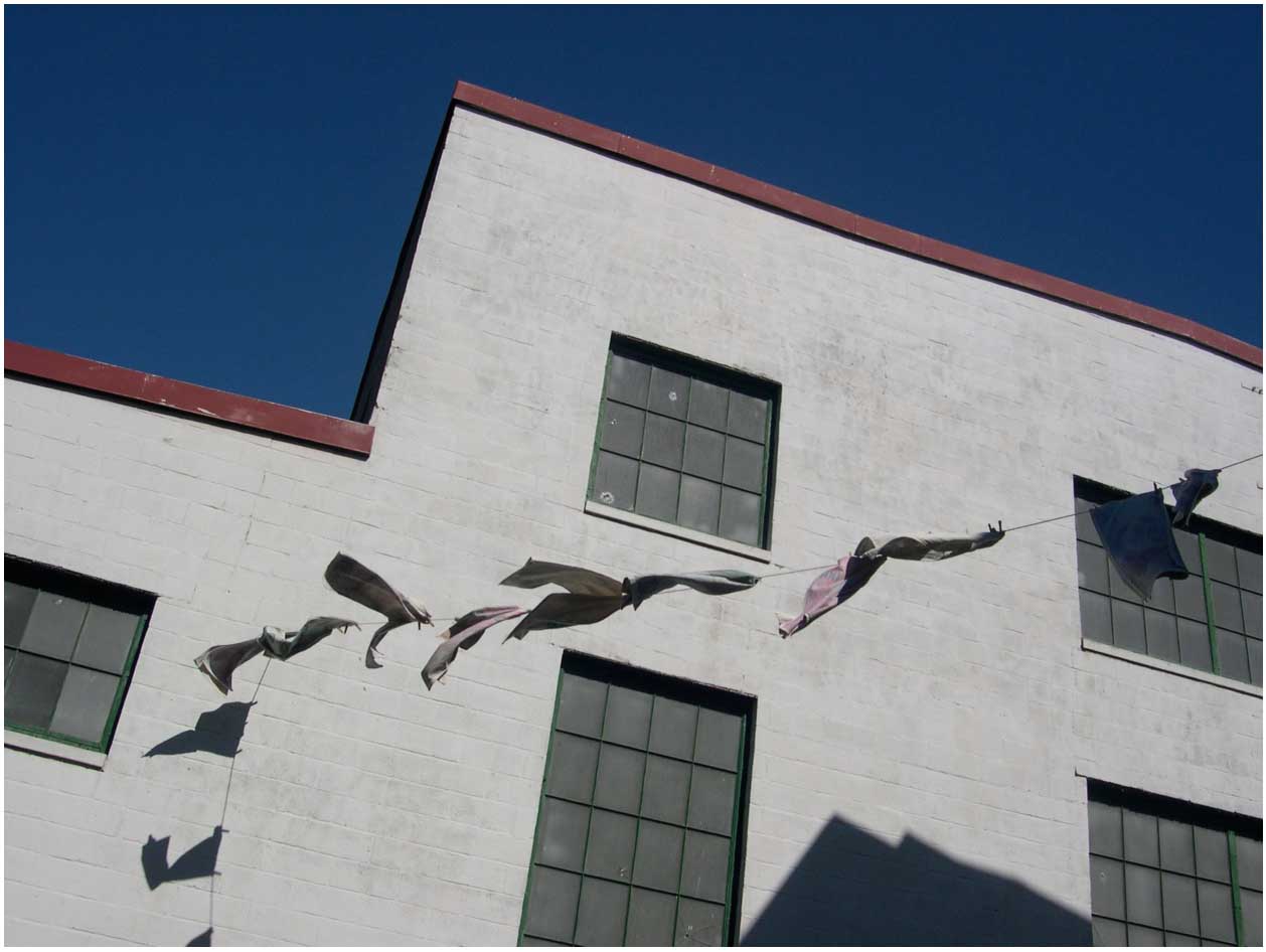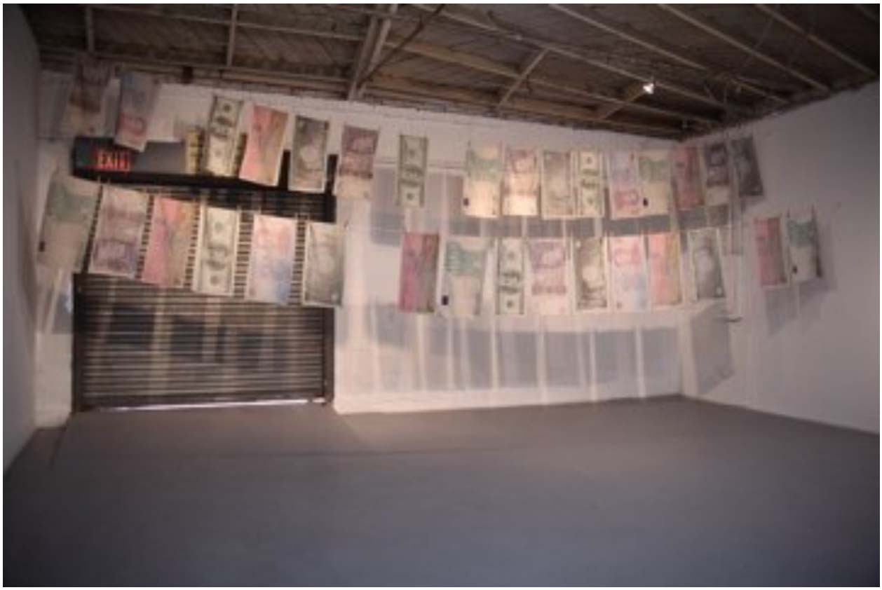 In addition to the current economic crisis, the installation makes reference to money laundering, the usually invisible and unpaid labor of women, and the relativity of the value of money and labor across national borders. Specifically, the installation questions easy assumptions about the difference between artistic labor and house labor collapsing the two together, and, by implication, domesticates the museum by foregrounding the hanging laundry (which is normally hidden in the back balcony).